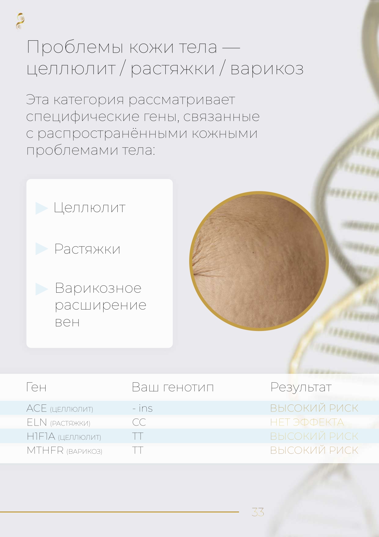 В данном тесте исследуется только предрасположенность к заболеваниям кожи, например, акне.